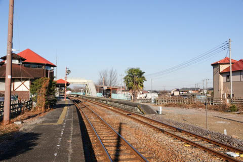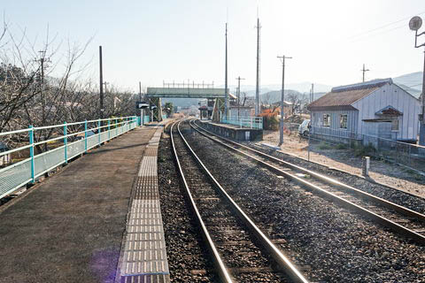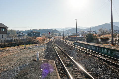 | 駅舎側下りホーム南端(越生寄り)から、下り小川町・高崎方面を見る。 右手上りホーム右側に、かつてあった側線の路盤が残る。 |