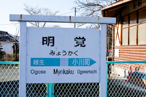 | 建植型駅名標。(当駅に吊り下げ型駅名標の設置はない) 駅名は、開業時の地名である 『比企郡明覚村』 より命名されている。 ”明覚村”の地名由来については諸説あるが、 鎌倉時代以前より当地は 「明覚郷」と呼ばれていたこと、 または桃木村にあった「妙覚寺」 に由来するとの 2説が有力のようだ。 尚、駅開業時の村役場は、駅の西1.5km程の ”現:ときがわ町桃木32” にあり、 現在は 『ときがわ町役場第二庁舎』 となっている。 本庁舎(現:町役場)は 1950年(昭和25年)に現在の ”ときがわ町玉川2490番地” に移転している。 |