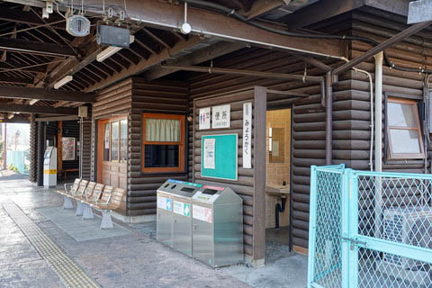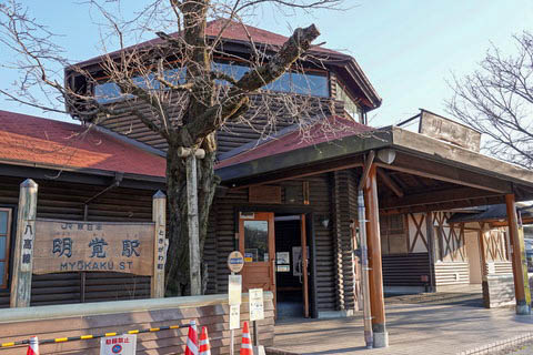 | 明覚駅駅舎。 赤い屋根の部分が駅舎であり、右手に隣接する駅舎風の建物は 公衆 トイレになっている。 |