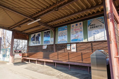 | 駅舎対面側上りホーム中程にある待合所の様子。 | ||||||||||||||||||||||||||||||||||||||||||||||||||||||||||||||||||
