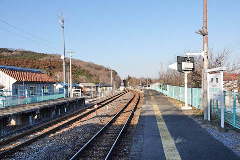 | 駅舎対面側上りホーム北端(小川町寄り)から、下り小川町・高崎方面を見る。 | 駅舎対面側上りホーム北端(小川町寄り)から、上り高麗川・八王子方面を見る。 右手に旧貨物側線と思われる路盤が確認出来る。 |