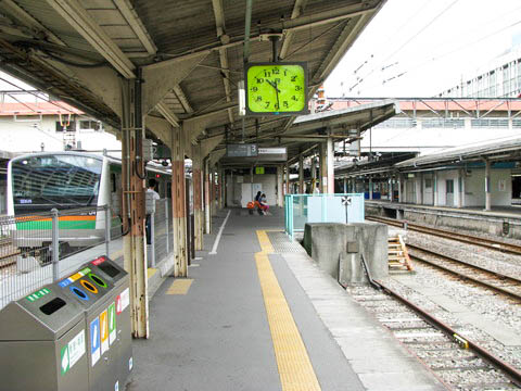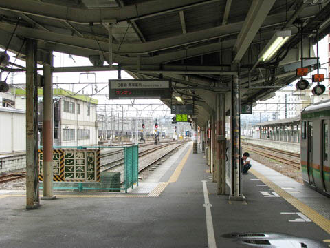 | 八高線3番のりばより、北側の線路終端を見る。 左手は2番のりばで、10:30発高崎線上野行き普通列車が発車を待っている。 当切り欠きホームの右側が4番のりばになる。 |