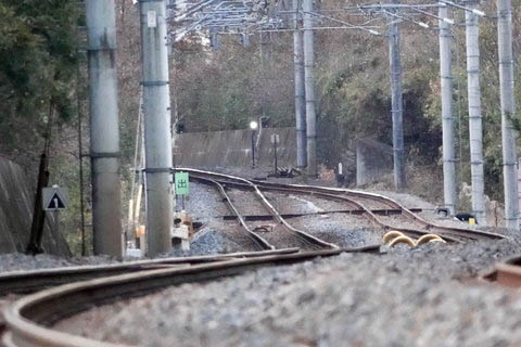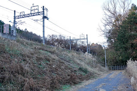 出入口。 信号場の表示はないが、ここが信号場の出入口と思われる。 右へ下り小川町方面(単線)、左へ上り武蔵嵐山方面(複線)となる。 ただし単線⇔複線の分岐器は、当出入口の右手(小川町寄り) 100m程先の築堤上にある。 |