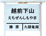| 建植式駅名標。 当駅は、福井県大野郡和泉村(いずみむら)下山に開業した。 2005年(平成17年)11月7日に大野市に編入され、現在に至る。 尚、駅開業前の当地(和泉村)の前身は、福井県大野郡下穴馬村 (しもあなまむら)下山であったが、1956年(昭和31年)9月30日に 下穴馬村と上穴馬村が合併し、和泉村となっている。 現在、 上穴馬村の一部は九頭竜湖に沈んでいる。 駅名は地名の”下山”からであり、既に存在していた山陰本線の下山駅 (京都府:1925年(大正14年)10月10日開業)と区別のため越前を冠している。 尚、”下山”とは荒島岳の麓(山の下)から。 |