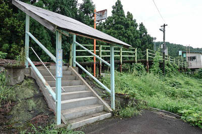 | ホーム出入口階段。 駅舎と線路は同一の高さにあり、ホームへは階段が設けられている。 |
