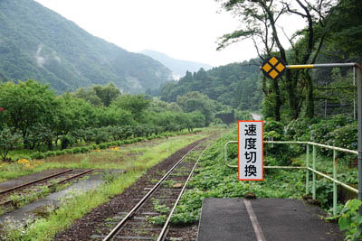 | ホーム東端(越前下山寄り)から、下り九頭竜湖方面を見る。 この先、当駅より終点の九頭竜湖駅までの区間は制限速度が 85km/h と なっており、ホーム端に「速度切換」の表示がされてる。 終着駅時代には、ホーム端右斜め前に上路式の手動?転車台を有した。 その跡地の半分は現在の五箇公民館に、もう半分は公民館内の緑地と なっており、現在では跡形もない。 1975年3月の時刻表には、九頭竜湖駅まで延伸した後も 5:52当駅初始発の越前大野駅行き気動車が記載されている。 |