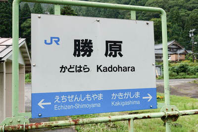 | 建植式駅名標。 駅開業前の当地は、1954年7月の合併により大野市となるまでは 福井県大野郡五箇村西勝原であり、村役場は現在の五箇公民館の 場所にあった。 尚、1889年(明治22年)4月の町村制施行までの 当地は大野郡西勝原村であった。 九頭竜川北岸には東勝原村も 存在し、周囲計5村の合併により、大野郡五箇村となっている。 当時は単体での”勝原”という地名はなく、駅名の由来は定かでないが、 地名である東西の勝原を統合して命名したものであろう。 尚、勝原とは片側のみが開けている野原の意とのこと。 |