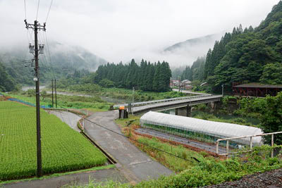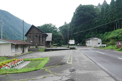 | 勝原駅前にて東側(下り九頭竜湖方面)を見る。 駅前を通る道は、福井県道173号上小池勝原線であり、 この先、鳩ヶ湯温泉を経由し、刈込池と三ノ峰への登山口である 小池公園にて行き止まっている。 駅開業時にはこの県道は開通していなかった。 |