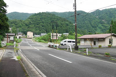 | 集落側より駅へ続く駅前通り。 線路は 『九頭竜川』 の堤防に向けて上り勾配となっており、 駅は勾配の頂点付近にあるため、駅へアクセスも上り坂となっている。 |