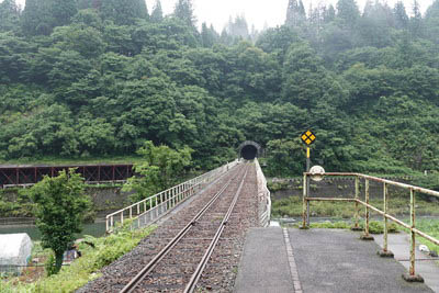 | ホーム南端(九頭竜湖寄り)から、下り九頭竜湖方面を見る。 ホーム先には第三九頭竜川橋梁があり、 その先に延長1915mの 『下山トンネル』 が見える。 |