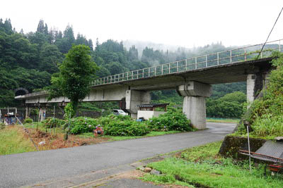 | 駅前の市道にて越美北線の橋梁を見る。 右側の市道に架かる橋は 『第一下山架道橋』、 左側の主桁の厚い 橋梁が 『第三九頭竜川橋梁』 で、竣功は1968年(昭和43年)10月14日、 設計荷重は ”KS-14” となっている。 『第三九頭竜川橋梁』 の先に 『下山トンネル』 が見える。 |