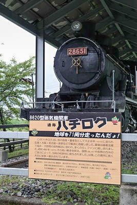 | 車両先頭部には当車両が越美北線内で貨物列車を牽引していたこと等が 詳しく記述された説明板が掲示されている。 28651機は、1919年(大正8年)12月5日大坂汽車製造会社で製造された。 初号機から数えると、8620形192号機となる。 |