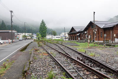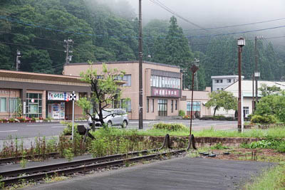 | 道の駅裏手より越美北線の線路終端を見る。 右手の側線には保線車留置線用の第三種車止め、左手の本線には 部分廃止線などに使用される第二種車止めが使用されてる。 計画では、岐阜県(南部は旧美濃国)と福井県(北部は旧越前国)とを 結ぶ 『越美線』 として着工されたが、全通は叶わなかった。 線路奥の平屋の建物は、『和泉地域交流センター』、 その右の二階建ての建物は、『くずりゅう化石ラボ・和泉郷土資料館』 である。 駅開業時の本線は『和泉強度資料館』 の前あたりまで敷設 されていたが、現在の位置に車止めが移されたのは、 1994年(平成6年)4月の道の駅開設によるものと思われる。 |