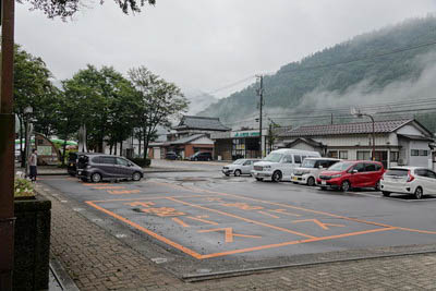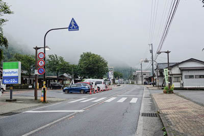 駅前の国道158号線にて、東側の九頭竜湖方面を見る。 当国道はこの先 飛騨高山、安房峠を経て信州松本へ続いている。 駅はコンビニの看板の左。 |