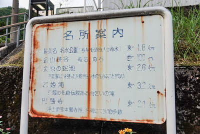 ホーム上の建植式名所案内標。 こちらにも 「伊野一本杉」と、「土岐頼芸の墓」が案内されている。 |