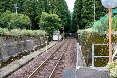 | ホーム北端(日当寄り)から、下り樽見方面を見る。 ホーム先50m程に「鍋ヶ瀧踏切」があり、 踏切左手には、踏切保安所のような建物が見える。 |