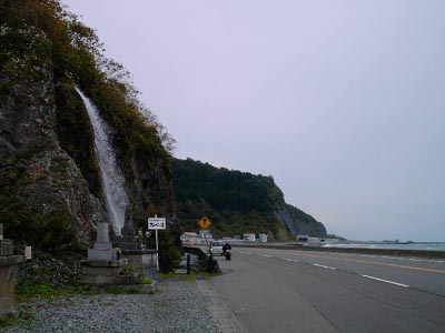 海に面した【フンベの滝】。道路の脇はすぐ海。海が荒れると、道路が波をかぶるのだ。