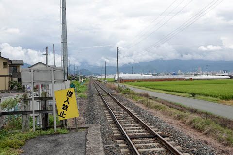 | ホーム西端(北山形寄り)から、上り山形方面を見る。 線路に並行する右手の道路からホームに直接アクセスする利用者が存在するようで、 ホーム端などに注意看板が設置されている。 右手(南側)の田畑の先、遠くに山形市街中心部の建物群が見える。 |