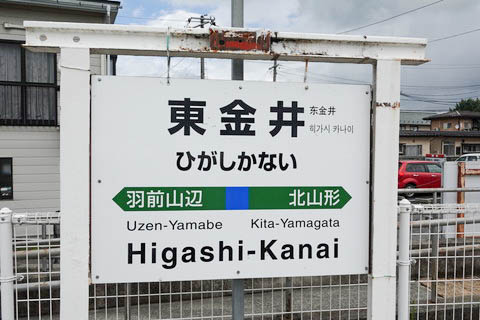 駅名由来は、開業時の地名である 『”金井村” の東寄りに位置した』 という説が有力である。 以下、駅名について推測も含めた調査結果を記す。 当駅は金井村役場(現 山形市金井コミュニティセンター)の南約700m に 開業した ”金井村” の中心駅であったが、『金井駅』 とはならなかった。 これは当駅の南方約10km 程に、郡違いの ”南村山郡金井村” が存在し、 同村の ”松原” 地区には既に奥羽本線の 『金井駅』 があり、当駅が開業する 9ヶ月前の1951年(昭和26年)3月に 『蔵王駅』 に改称されたものの、 混同を避けるため 『金井駅』 との命名は回避されたものと思われる。 一方、字名の 『陣場』(旧陣場村)が駅名に採用されなかったのは、 地域的に小さく、知名度が低かったことによるものであろう。 また、当駅開業時には山形交通村山線の 『西金井駅』 が 『蔵王駅』 の 北西付近にあったようで、駅名の命名についてはこちらとの関連性も捨てきれない。 |