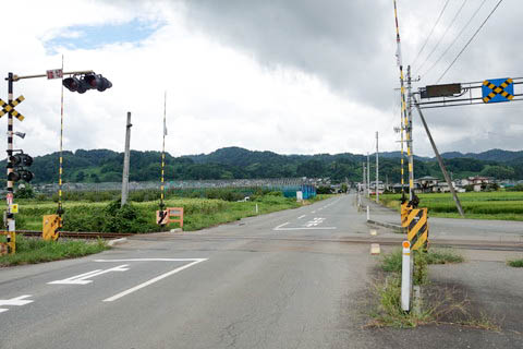『金沢踏切』 前にて西側を見る。 駅は踏切先右側である。 400m程先の道路右手に見える集落は中山町金沢地区である。 金沢地区の中心部は、900m程先の国道458号線沿いにある 『金沢公民館』 で 旧金沢村役場の跡地に建てられている可能性が高い。 |