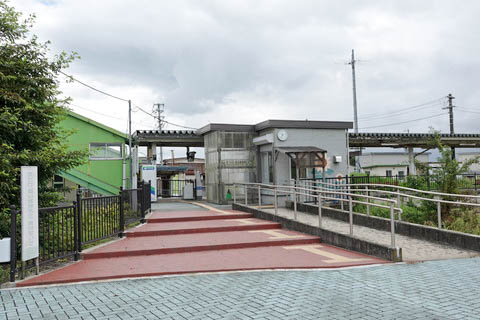 | ホームの跨線橋階段前より、西口駅舎を見る。 小さな駅舎はきっぷうりばのみで待合室はない。 東口からの利用者を考慮のためか、出入口はホーム側を向いている。 また、簡易Suica自動改札機も撮影立ち位置左後方のホーム端に置かれており、 東西両方からの利用者に不便のないような配置がなされている。 |