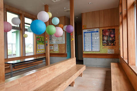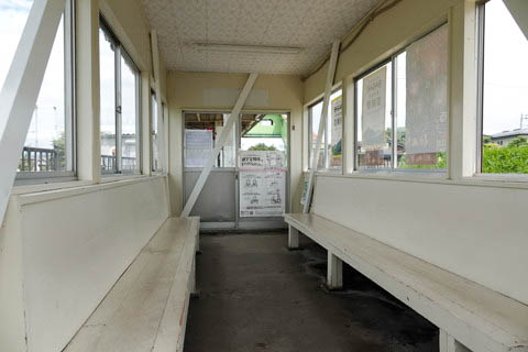 | ホーム上の待合室内の様子。 駅開業当時からの古い建物であり、各所に筋交いによる補強がなされている。 |