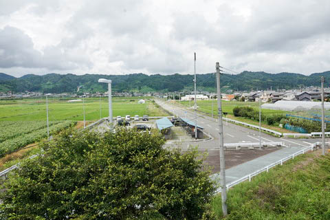 | 構内跨線橋通路より、西口駅前を見る。 樹木の影で駅前広場が見えないが、その先の上屋がある部分が 中山町の設置による駐輪場と駅利用者駐車場である。 駅前から西へ延びる駅前通りは、600m程で国道458号線に突き当たる。 駐輪場や駅前通りは、駅の西口開設に合わせて整備されたとのこと。 整備される以前は田園地帯であった。 また、駅前通り右手(北側)の市街地は、旧来からの集落であるが、 1960年〜1980年代にかけて宅地造成が進んだ 『梅ヶ枝町地区』 である。 |