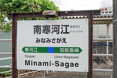 | 建植型駅名標。 当駅開業時には既に 『寒河江駅』 が存在しており、 駅名は 『寒河江駅』 の南側に開業したことに由来する。 尚、当地の行政地名は、明治期より 『西村山郡島村』 ⇒ 『西村山郡寒河江村』 ⇒ 『西村山郡寒河江町』 ⇒ 『寒河江市』 と変遷している。 |