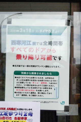 | 待合室扉に貼られた掲示物。 当駅に関しては、前乗り・前降りが適用されないようだ。 ワンマン運転のため、一度に多くの降車客(通学客)を捌ききれないためであろう。 運賃精算に関しても信じられないような文言が・・・ 写真が小さく、また反射により見にくく、たいへん申し訳なく。 |