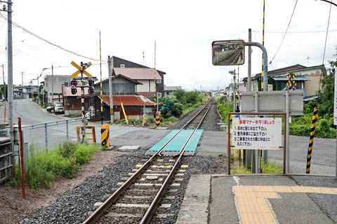 | 駅前の一般道にて東側を見る。 駅は踏切手前左手。 駅周囲は主に住宅街となっている。 |