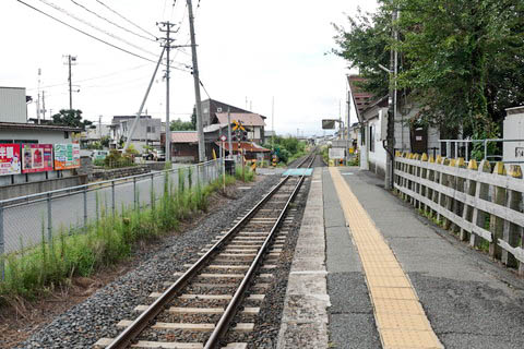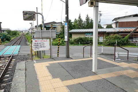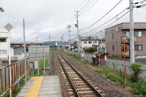『六供町踏切』 より、左沢方面を見る。 駅舎はなく、6両対応のホーム上に待合室が設置されている。 |