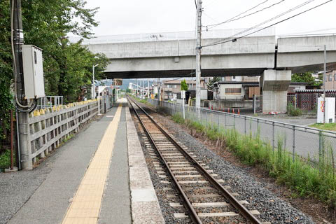 | ホーム南端(寒河江寄り)の待合室脇より、下り左沢方面を見る。 ホーム上をオーバーパスしているのは、2004年(平成16年)11月に完成した 山形県道23号天童大江線の 『西寒河江跨線橋』 である。 |