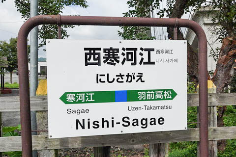 | 建植型駅名標。 当駅開業時には既に 『寒河江駅』 が存在しており、駅名は 『寒河江駅』 の北西側に 開業したことで 『北寒河江』 という駅名も想像できるが、寒河江市に 『北寒河江』 という 地区・地域名はなく、最初から候補にはならなかったものと思われる。 駅開業時の当地の行政地名は、『西浦』 であり、寒河江の西側とのことから 『西寒河江』 の駅名となったという説が有力である。 |