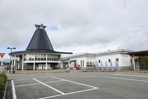 『大江町交流ステーション』 駅舎側出入口。 訪問の時点で、開館時間は 8:00〜17:00、入場無料。 内部は毎年9月に行われる 『おおえ秋まつり』 で使用される囃子屋台などの展示を始め、 観光案内、多目的ホール、NHKの朝ドラ 『おしん』 の最上川ロケ写真などの展示がある。 大江町商工会も入居している。 |