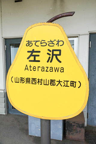 | 洋梨をモチーフとした建植型駅名標。 左沢駅のある大江町では、洋梨の一種である 『ラ・フランス』 の生産が盛んであり、 その生産量は県内6位(全国6位)である。(1位は天童市) 大江町は町全体の農業産出額において果実が約7割を占めているとのこと。 |