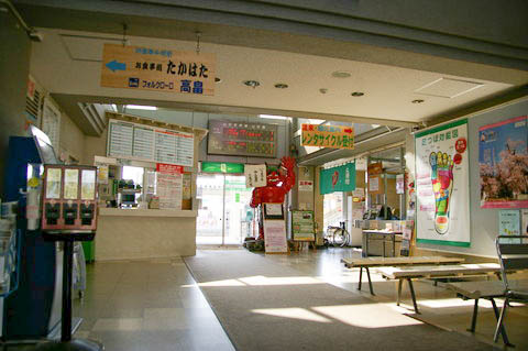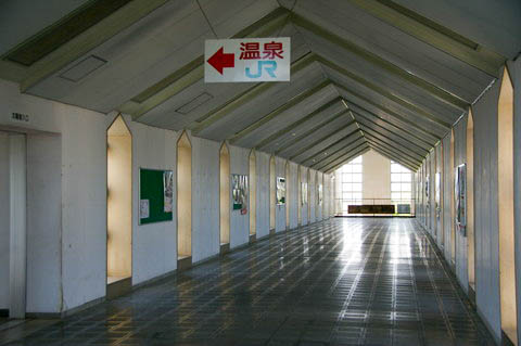 | 駅舎内の様子。 大きな駅舎に対して駅舎内のスペースはそれほど広くない。 待合ベンチは右手の簡易ベンチのみ。 その先の緑色の暖簾があるところが日帰り温泉入口、正面に改札口(簡易Suica改札機は 自動ドアの先に設置)、撮影立ち位置すぐ左に売店とその奥に飲食店がある。 |