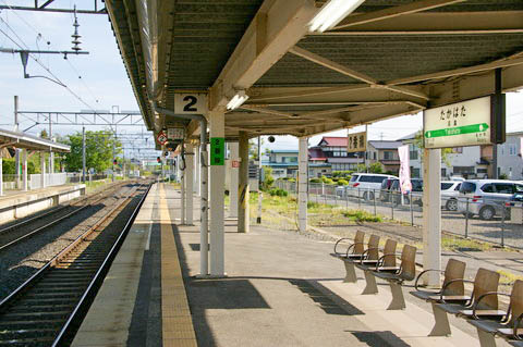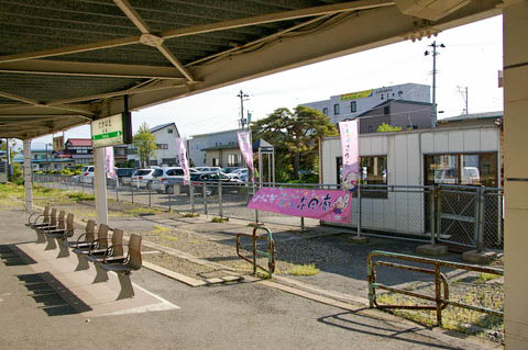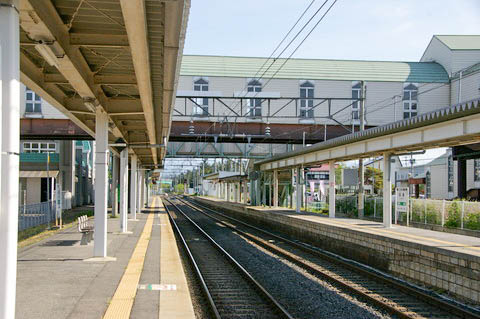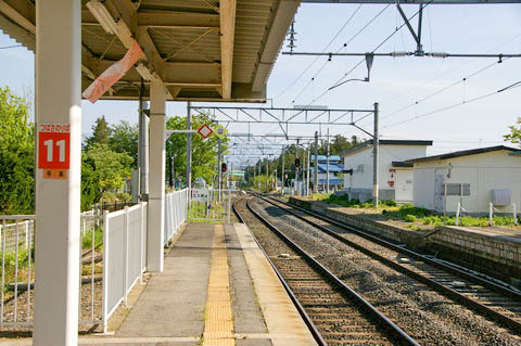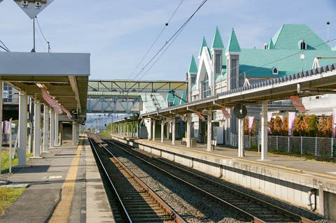 | 2番のりば南端(置賜寄り)から、下り山形・新庄方面を見る。 右手の1番のりば側(東側)にある駅舎は、地元出身の童話作家・浜田広介の童話の 世界をモチーフにしており、メルヘンチックな外観をしている。 ちょっと結婚式場みたいにも見える。 |