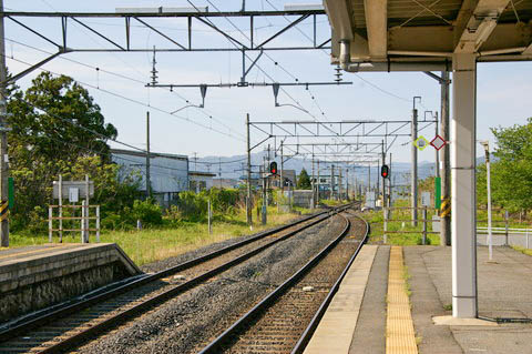 | 駅舎側の1番のりば南端(置賜寄り)から、上り米沢・福島方面を見る。 構内配線は、山形新幹線開業前に駅舎のあった2番線側の1線スルーとなっている。 山形新幹線開業にあたり、副本線の当1番線側に新幹線を停車させ、直線の2番線側は 通過線および列車交換線とし、駅舎も新幹線が停車する東口側へ移転となっている。 |