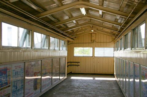 | 西口待合室(プレハブ)と自由通路昇降口。 待合室は通常施錠されており、朝夕の臨時改札時のみ使用されるようだ。 (待合室奥のホーム側に出口があり、2番のりばへ直接入場可能な構造になっている) かつての駅のエントランスは市街地のあるこちら側の西口であり、 駅の機能を東口に付け替えて集約するよりも、 橋上駅舎とした方が利便性が良かったように思えるが・・・ |