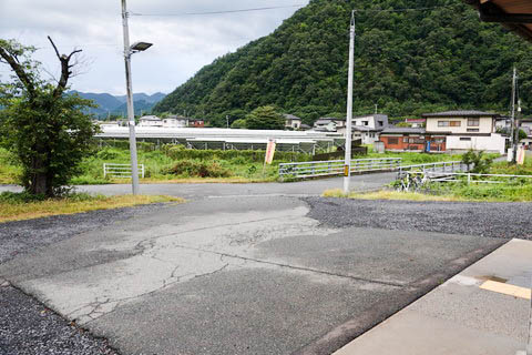 | 駅舎前より駅前を見る。 駅前すぐを 『村山高瀬川』 支流の 『大門川』 が流れており、 川には 『高瀬橋』 が架かっている。 立地の関係もあり駅前に民家は少なく、集落の中心はこの先1km程にある。 |