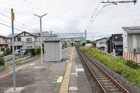 | 仙山線(狭軌)2番のりば北寄り(南出羽寄り)から、上り仙台方面を見る。 ホームには北山形駅と同形状の待合室が設置されている。 尚、ホームにベンチはなく、座っての列車待ちができる場所は待合室のみとなっている。 |