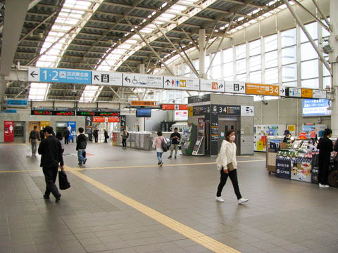| 改札前コンコースのきっぷうりば前付近より、駅出入口部全景を見る。 かつてはきっぷうりば右側に ウォークインタイプの 『みどりの窓口』 があったが 2021年(令和3年)11月に営業を終了、『話せる指定席券売機』 に置き換えられている。 |