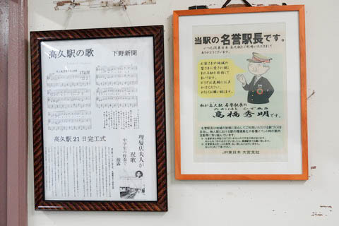 2012年(平成24年)4月に初代が就任してから、JRのOB等により駅の 管理・清掃、イベント等、の地域交流などを行っているとのこと。 現在の名誉駅長が何代目かは不明。 高久駅の歌(正式には”高久駅新築落成の祝歌”)は、かつて駅前で理髪店を営んでいた ”大倉キミ”さんという方の作詞で、1965年(昭和40年)10月21日の新駅舎完工記念式典で 合唱されたとのこと。 地域の自然や名所などを盛り込んだ学校の校歌のような 詩であるが、なかなか良く出来ている。 |