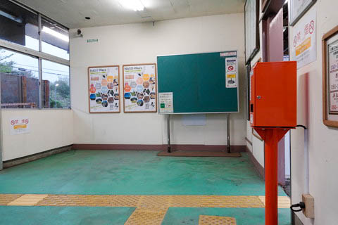 同じく駅舎内の様子。 有人駅時代にあったと思われる出札窓口は、無人駅化による改修で壁となっている。 |