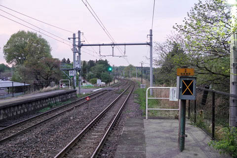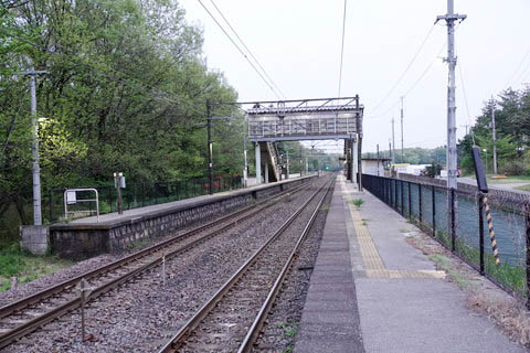| 駅舎側下り1番のりば南端(黒磯寄り)付近から、上り黒磯・宇キ宮・東京方面を見る。 右手に駅舎前を通る 『栃木県道211号豊原高久線』 が見える。 この県道の大部分は1920年(大正9年)3月10日に 急勾配やカーブの多い 黒磯-黒田原間のルート変更を行った 東北本線の旧線を利用したもので、 右斜め前方の道路が旧線跡になる。 旧線は当駅とクロスして敷設されており 開業時の当駅(当時は高久信号場)も旧線上にあった。 旧線は 黒磯-白河間で補助機関車を連結し、急勾配に対応していた。 |
