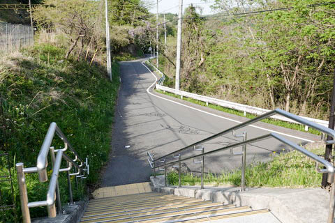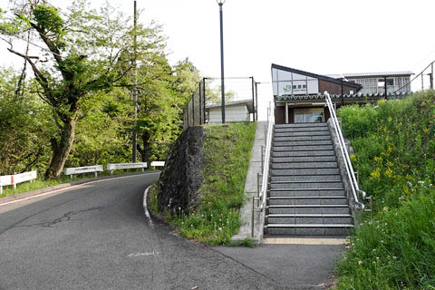 | 南口階段上から階下を見る。 駅周囲はかなり起伏のある地形となっている。 右手の上り坂は、かつての貨物積み卸し場への道と思われる。 |