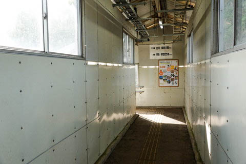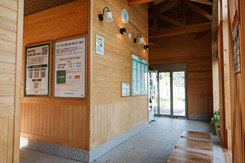 | 駅舎内の待合スペースより、駅舎出入口方向を見る。 左手がホーム方向である。 出入口から待合スペースを通らないとホームへは行けない構造になっている。 また、出入口前には飲料の自販機が置かれている。 |