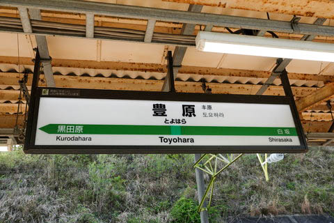 | 建植型駅名標。 駅名は開業時の地名である 『那須郡豊原村字水原』 より 村名が採用されている。 『豊原』 は ”豊かな実りを祈願” してつけられた願望地名である。 また、日本統治時代の樺太や台湾にも同名の 『豊原駅』 が存在したため、一時期は 『下野豊原(しもづけとよはら)』 と改称したが、日本の敗戦により再び 『豊原』 に戻っている。 |