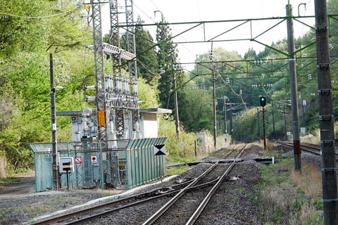 『豊原き電区分所』。 黒磯変電所と白河変電所のき電境界となっており、変電所相互における 交流電圧の位相差による障害を防ぐために設置されている。 この先に無電区間(デッドセクション)の ”交交セクション” がある。 |