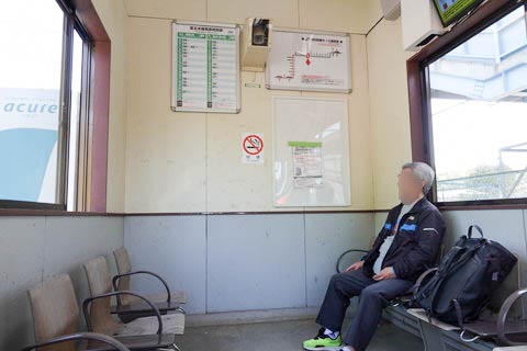 | 駅舎出入口左側の待合室内の様子。 駅利用者がおられたため、了承をいただいてから撮影。 写っていないが、撮影立ち位置右側に乗車駅証明書発行機が設置されている。 |